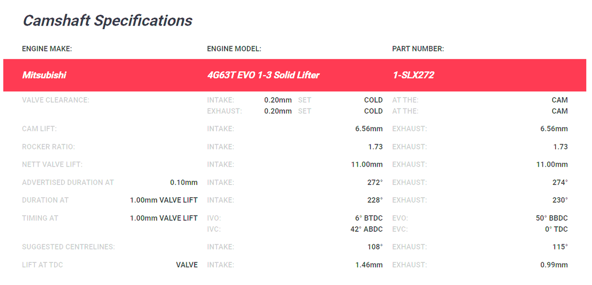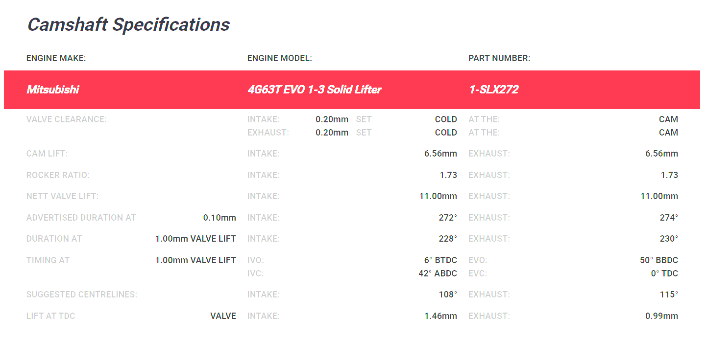 EVO 1-3/VR4 solid lifter 272° Camshafts. The best all round performing motorsport cams. These are the solid lifter version of our mega popular TX272 profile. Suits racing 4G63 engines in the 400-700hp range. 54-64mm turbo size range. Not for OEM hydraulic lifters, must convert to solid lifter. For up to 8500rpm and 35psi boost Kelford Cams recommend valve spring KVS63-BTK.