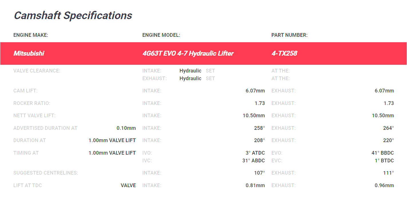 258°/264° | 10.50mm/10.50mm Valve Lift