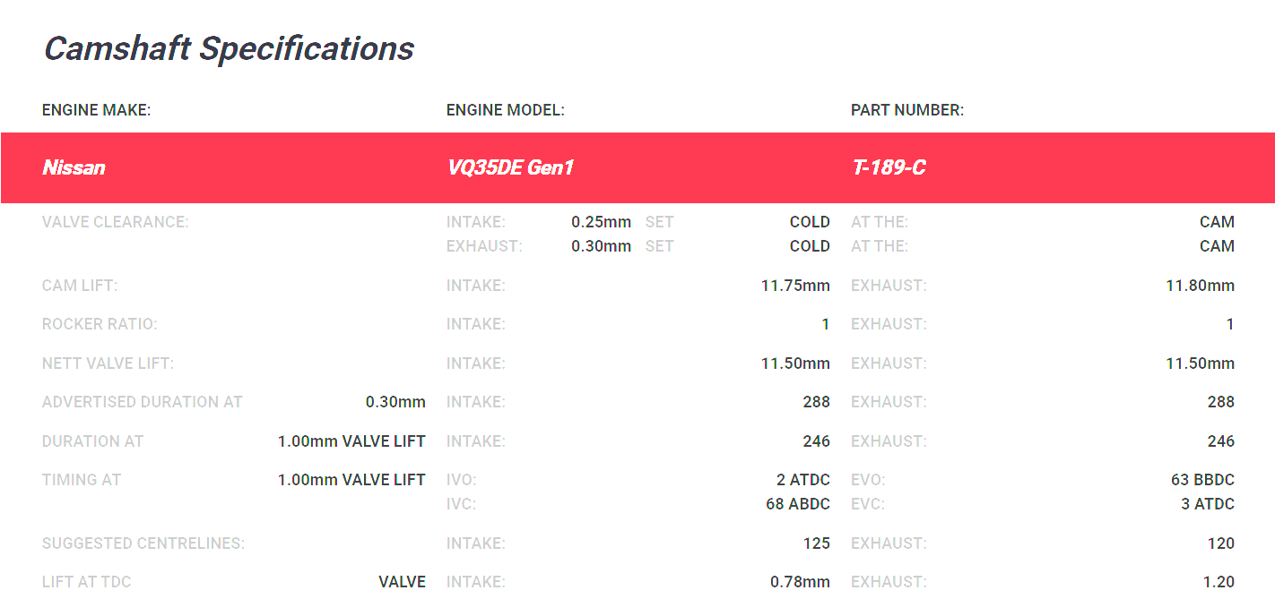 Kelford Nissan VQ35DE Turbo Camshafts 288/288 T-189-C