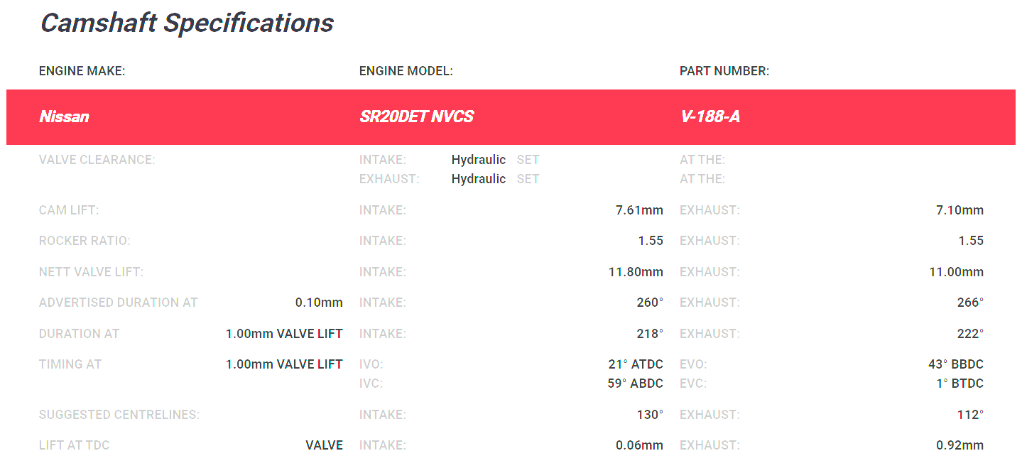 Kelford Nissan SR20 VCT S14 S15 Camshaft 260/266 V-188-A